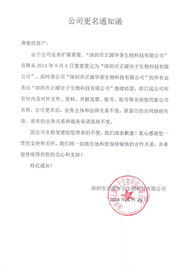 由于公司業(yè)務(wù)拓展需要,“深圳市正源華茶生物科技有限公司”名稱從2014年8月6日變更登記為“深圳市正源分子生物科技有限公司”。特此通知,詳情請瀏覽圖片內(nèi)容。