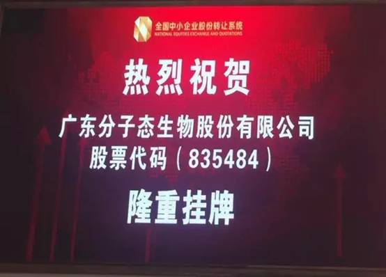 2016年4月6日,廣東分子態(tài)生物股份有限公司舉行正式掛牌儀式,股票簡稱“分子態(tài)”,是中國首家分子植提上市企業(yè),股票代碼:835484。分子態(tài)董事長周粵生以及公司各級高層領(lǐng)導(dǎo)出席掛牌儀式,隨著上市鐘聲宏亮的響起,他們共同見證了分子態(tài)上市這一輝煌時刻。至此,分子態(tài)將站在歷史的新高點,迎來跨越發(fā)展的重大機(jī)遇。