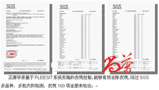 正源華茶基于PLEESIT系統(tǒng)實(shí)施的農(nóng)殘控制,能夠有效去除農(nóng)殘,經(jīng)過SGS多品種、多批次 的檢測,農(nóng)殘100項(xiàng)全部未檢出。