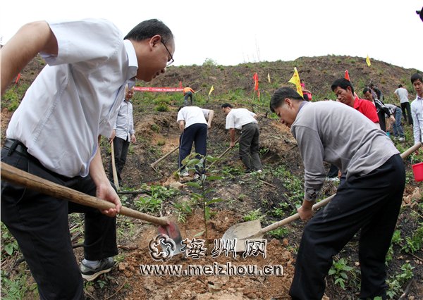 在植樹現(xiàn)場,三一重工、正源華茶、金森林等在梅投資企業(yè)的負責人,不停地揮鋤挖穴、填土,然后澆水,仔細地栽下一棵棵樹苗。一個上午,他們就種下木荷、蔭香、山杜鵑等1000多株樹苗,為整個山坡添上一層新綠。