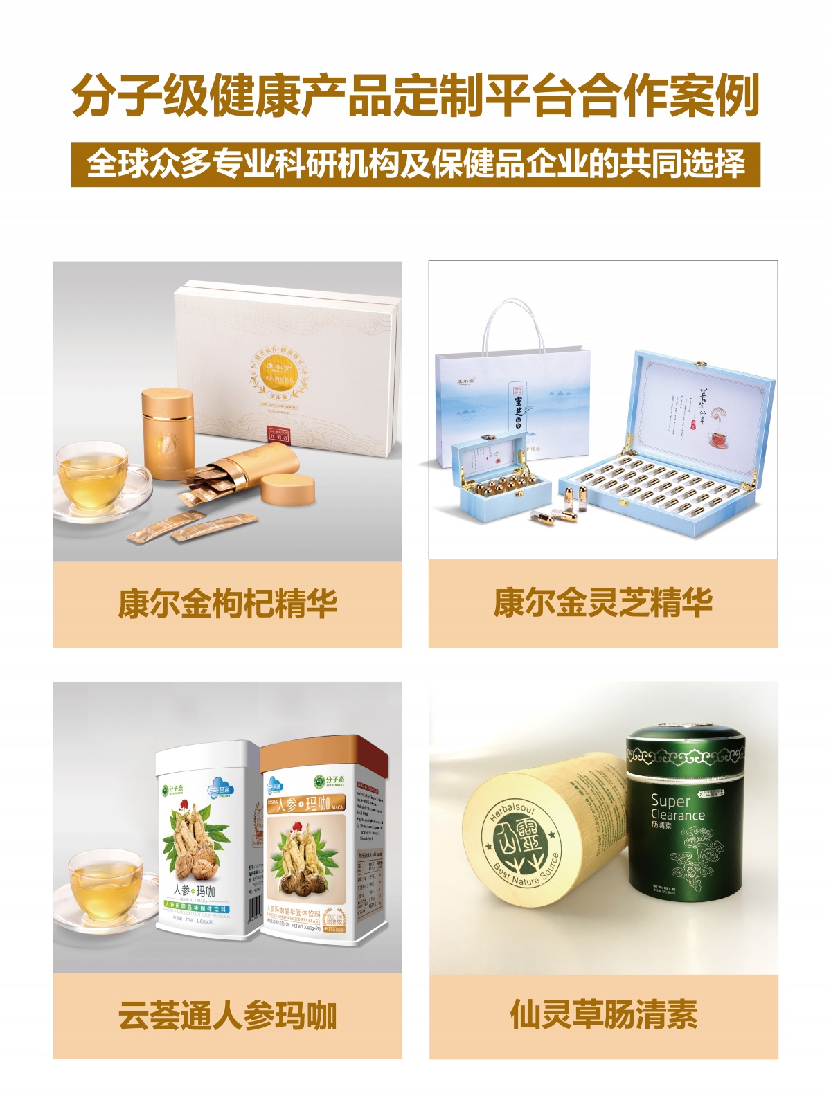分子態(tài)為客戶量身定制OEM/ODM生產(chǎn):保健功能產(chǎn)品、藥食同源膳食食品、營養(yǎng)補(bǔ)充劑產(chǎn)品、中藥(植物藥)、功能茶等五大系列產(chǎn)品。百余種經(jīng)典單、復(fù)方產(chǎn)品供客戶選擇,全面覆蓋終端人群。同時(shí),將為客戶提供一站式的大健康定制產(chǎn)品解決方案,可實(shí)現(xiàn)包含配方設(shè)計(jì)、產(chǎn)品開發(fā)、包裝定制等服務(wù)。