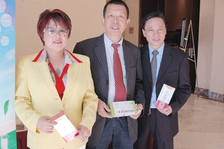 左起:東方文化聯(lián)誼會(huì)會(huì)長(zhǎng)林淦花、正源華茶董事長(zhǎng)周粵生和總經(jīng)理陳禮彬在產(chǎn)品推介會(huì)上。圖片來(lái)源:僑報(bào)記者邱晨攝