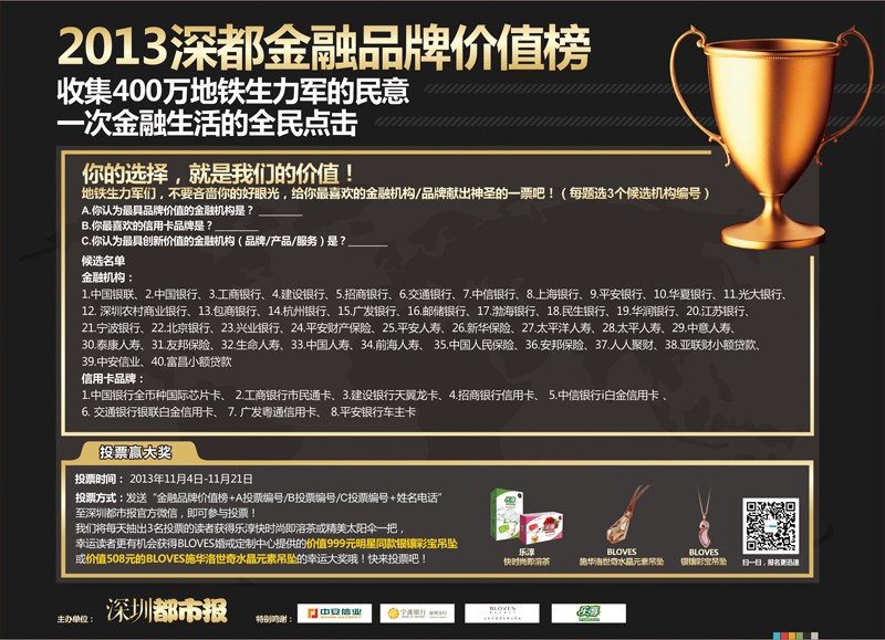 由《深圳都市報》主辦,正源華茶全力支持的2013深都金融品牌價值榜評選活動在11月1日拉開帷幕,本次活動為期一個月,通過深圳都市報、網(wǎng)絡(luò)等多種形式,邀請深圳400萬乘坐地鐵生力軍參與評選,共同見證本年度金融機構(gòu)的創(chuàng)新碩果。